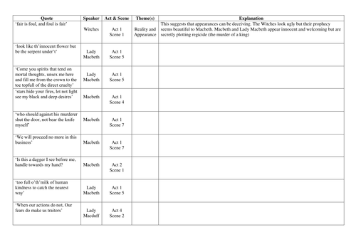 Macbeth Quotes And Themes Worksheet Teaching Resources
